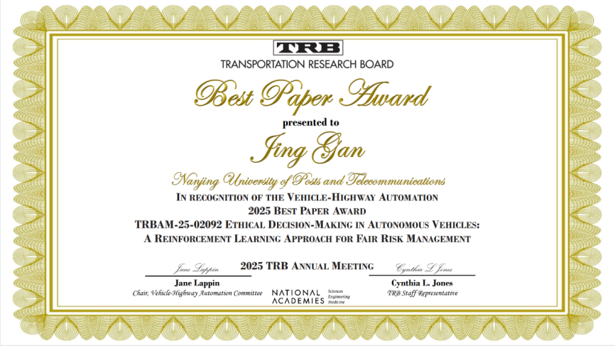 我院教師論文獲交通領(lǐng)域國際頂會TRB ACP30 Committee最佳論文獎